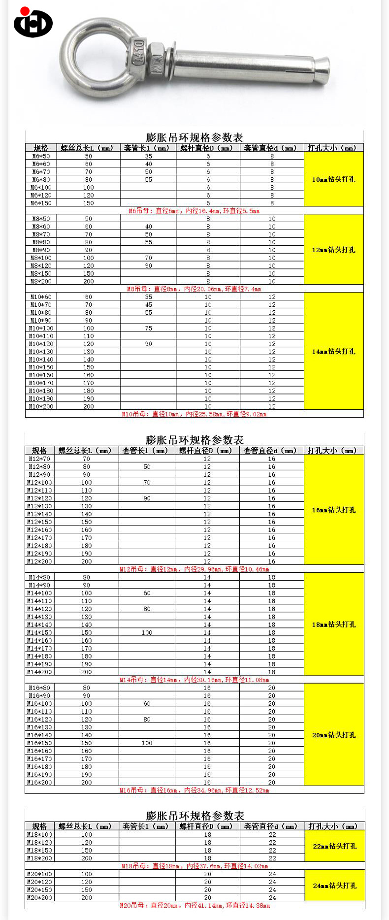 Anchor Bolt Eye Duty Duty ใช้การออกแบบที่ได้มาตรฐานซึ่งผู้ใช้จำเป็นต้องเจาะรูของเส้นผ่านศูนย์กลางและความลึกที่สอดคล้องกันบนพื้นผิวแทรกสลักเกลียวและหมุนเพื่อให้แน่น การออกแบบเวอร์ชันขยายสามารถปรับให้เข้ากับพื้นผิวต่าง ๆ เช่นคอนกรีตอิฐสีแดงกระเบื้อง ฯลฯ โดยไม่จำเป็นต้องใช้เครื่องมือเพิ่มเติมหรือการดำเนินการที่ซับซ้อน
